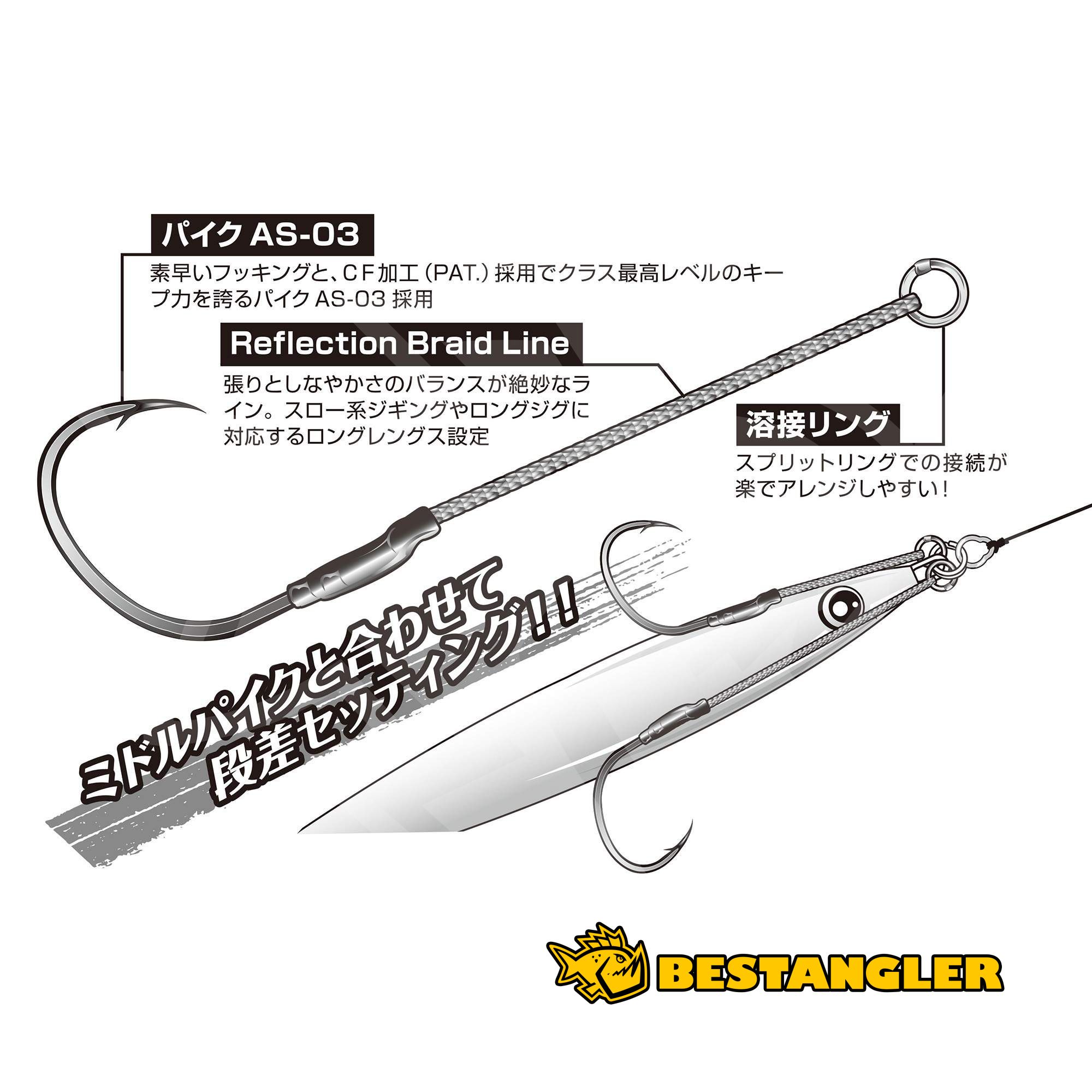 DECOY DJ-79 Long Pike je dlouhý singlový asistový háček postavený na osvědčeném háčku Pike AS-03, který patří mezi stálice lehkého a středního jiggingu. Je vázán na pružné originální pletené šňůrce (Reflection Blade Line), jejíž délka je oproti modelu Middle Pike výrazně prodloužená. Díky tomu háček pracuje volněji, snadněji se dostává do kontaktu s rybou a zvyšuje se úspěšnost záseku i při opatrných záběrech.