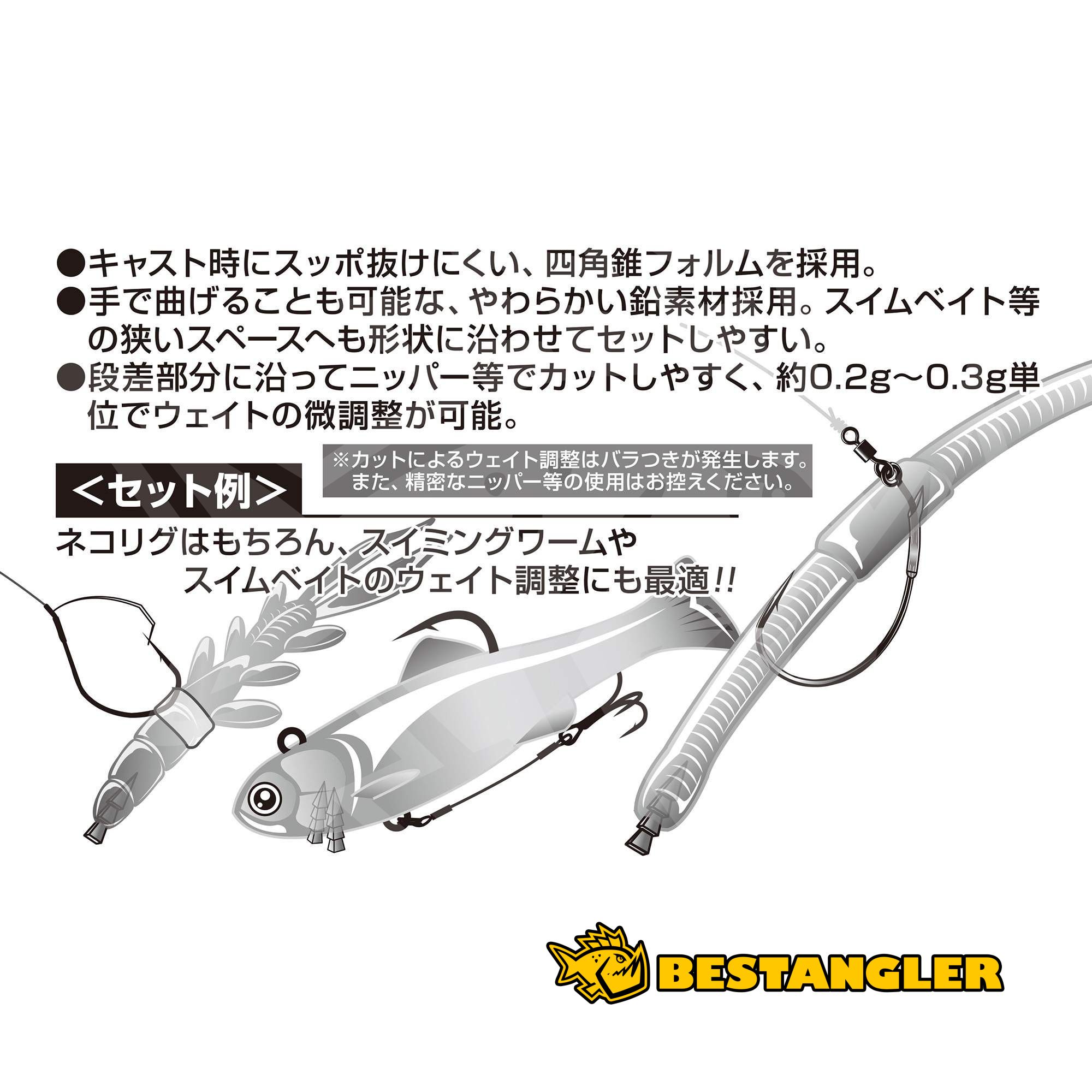 Závaží lze snadno zkracovat po jednotlivých segmentech, takže umožňuje velmi jemné nastavení hmotnosti přibližně po 0.2 – 0.3 g. Vysoce hustý materiál lze jednoduše střihat nebo lehce tvarovat ohnutím. Skvělá komponenta pro rybáře, kteří potřebují přesně přizpůsobit chování nástrahy aktuálním podmínkám.