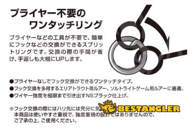 Kroužek je vyroben z pevného drátu s povrchovou úpravou NS Black, která zvyšuje odolnost a eliminuje nežádoucí odlesky. Quick Ring je ideální pro malé přívlačové nástrahy – zejména trout area, mikro woblery, cranky a ultralehké plandavky. Perfektní volba všude tam, kde je nutná častá a rychlá výměna háčků.