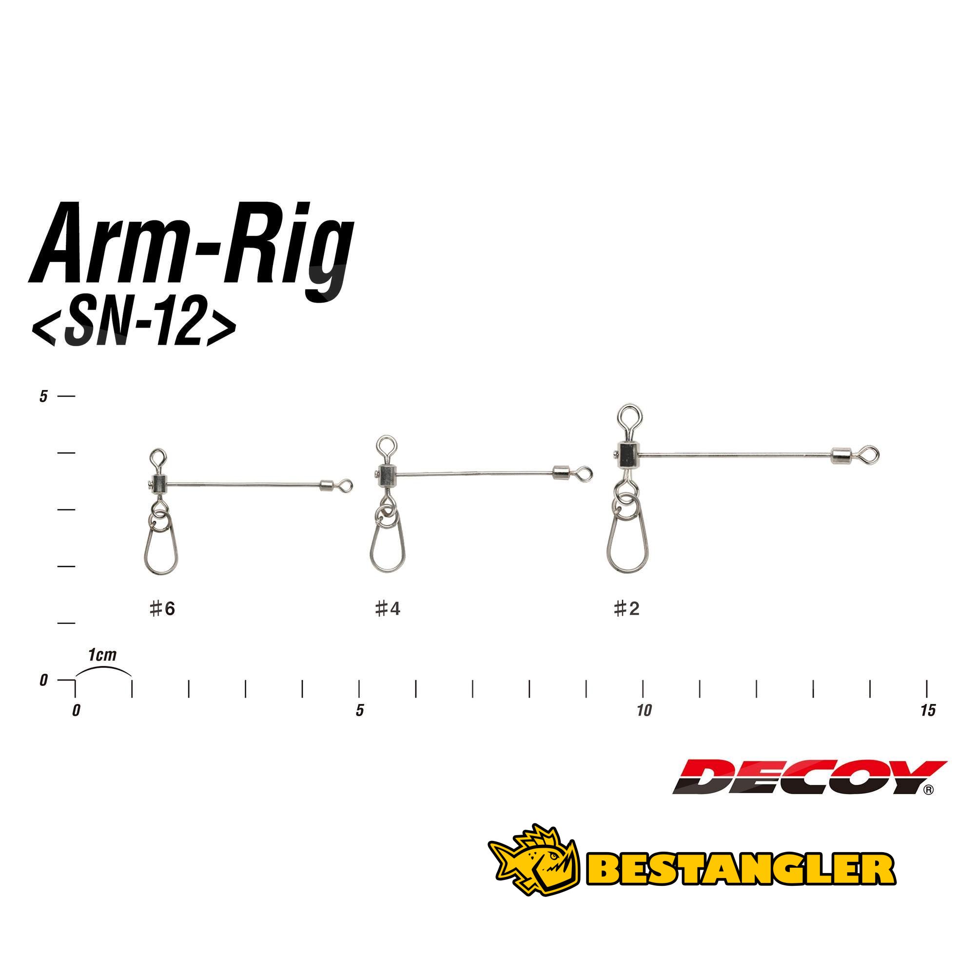 DECOY SN-12 Arm-Rig je speciální kloubový systém navržený pro sestavování Carolina Rig montáží a lov s přídavnou zátěží. Hlavním konstrukčním prvkem je do boku vyvedené ocelové raménko, které efektivně oddaluje nástrahu od kmenové šňůry a spolehlivě tak zabraňuje zamotání sestavy i při hlubinném vertikálním lovu. Montáž je standardně osazena odnímatelnou karabinkou typu Split Snap, která slouží k okamžitému nacvaknutí nebo výměně olova. Po jejím sejmutí lze do systému snadno navázat slabší trhací vlasec pro bezpečné uchycení zátěže v těžkém vázkovém terénu. Tento technický prvek najde výborné uplatnění při vertikální přívlači z lodi i klasickém chytání ze břehu.
