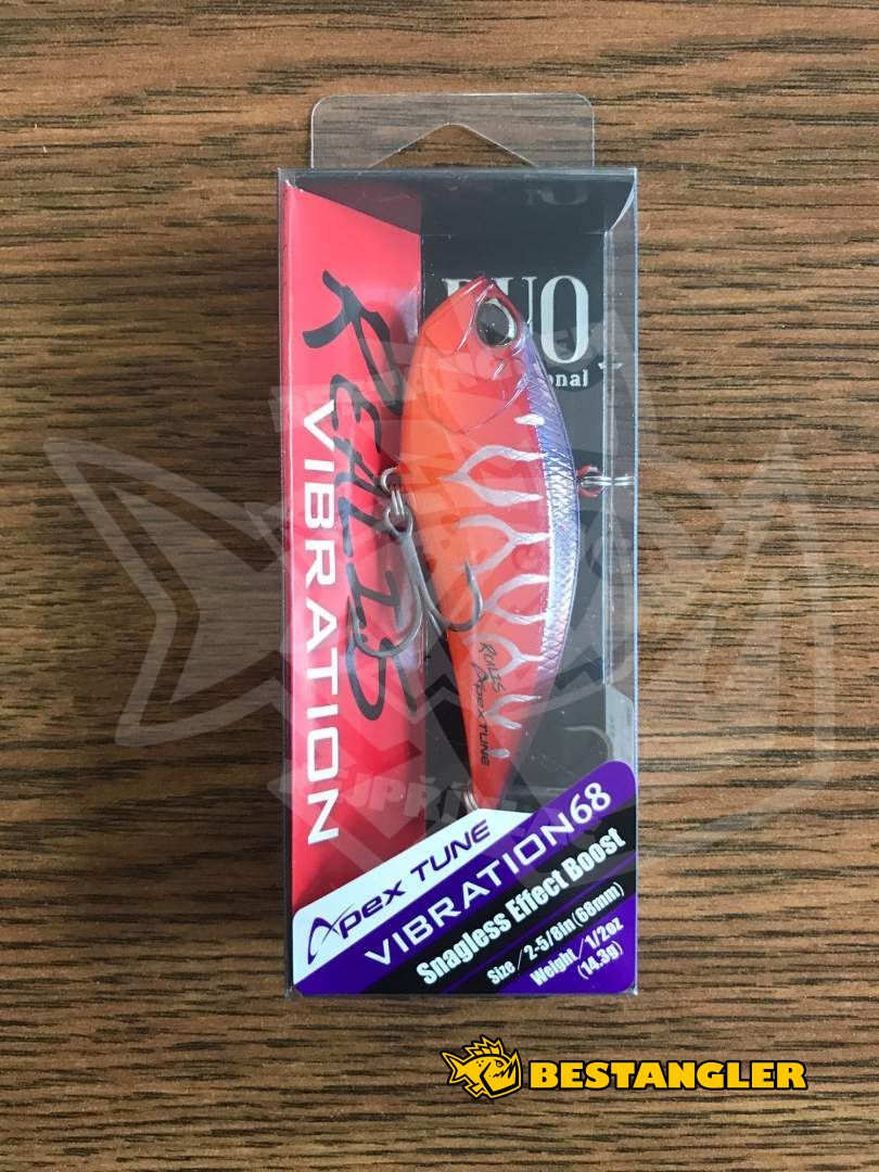 DUO Realis Vibration 68 Apex Tune je vylepšená verze populárního Vibrationu, vyladěná rybářskou legendou Aaronem Martensem. Díky lehčí konstrukci a mírně posunutému oku uchycení ještě méně vázne než klasický model. Z nástrahy byly odstraněny chrastící kuličky, takže je výrazně tišší a ideální pro opatrné dravce i silně prochytaná místa.