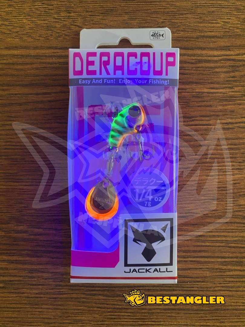 Jackall Deracoup patří mezi nejlepší tailspinnery na světě a dlouhodobě patří k nástrahám, na které se rybáři mohou spolehnout v jakýchkoliv podmínkách. Má kompaktní, těžké tělo s většinou hmotnosti soustředěnou v přední části, díky čemuž se s ním dá nahazovat opravdu daleko – a to i proti silnému větru. Malé tělo rybám usnadňuje nasátí nástrahy, takže většina záběrů končí úspěšným zásekem. Colorado rotační plíšek na kvalitním obratlíku se roztočí i při velmi pomalém vedení a vytváří silné vibrace, které ryby spolehlivě přitahují.