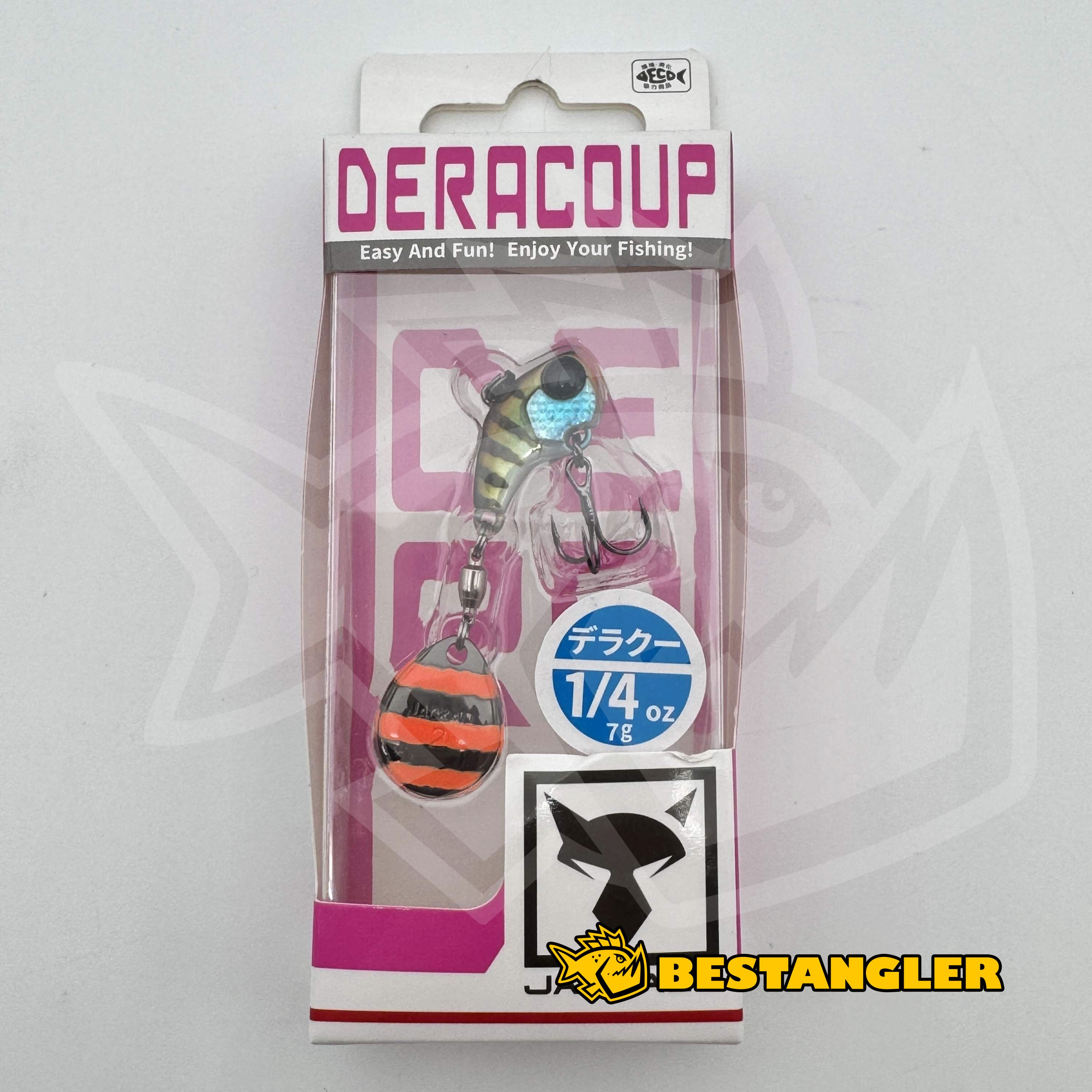 Jackall Deracoup patří mezi nejlepší tailspinnery na světě a dlouhodobě patří k nástrahám, na které se rybáři mohou spolehnout v jakýchkoliv podmínkách. Má kompaktní, těžké tělo s většinou hmotnosti soustředěnou v přední části, díky čemuž se s ním dá nahazovat opravdu daleko – a to i proti silnému větru. Malé tělo rybám usnadňuje nasátí nástrahy, takže většina záběrů končí úspěšným zásekem. Colorado rotační plíšek na kvalitním obratlíku se roztočí i při velmi pomalém vedení a vytváří silné vibrace, které ryby spolehlivě přitahují.