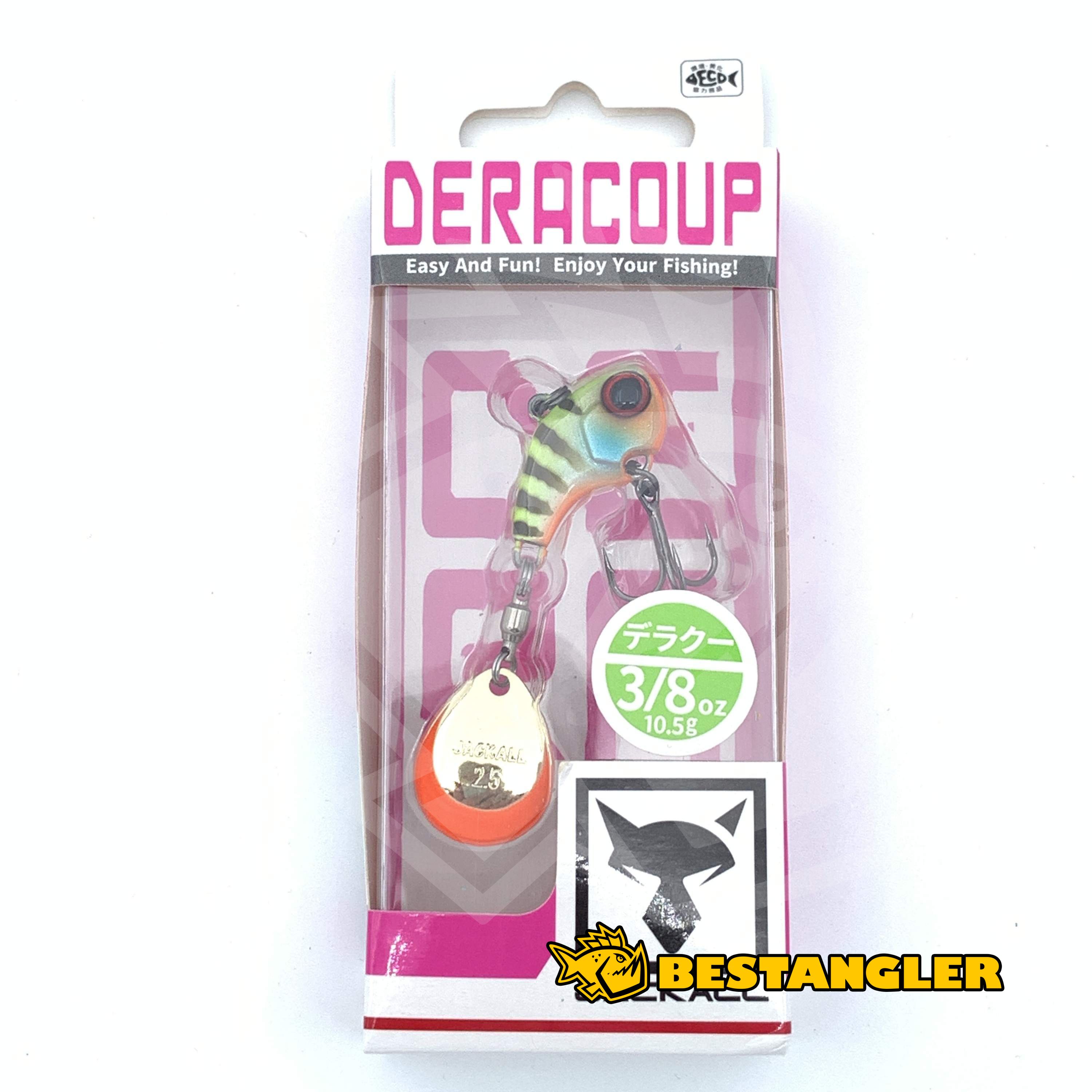 Jackall Deracoup patří mezi nejlepší tailspinnery na světě a dlouhodobě patří k nástrahám, na které se rybáři mohou spolehnout v jakýchkoliv podmínkách. Má kompaktní, těžké tělo s většinou hmotnosti soustředěnou v přední části, díky čemuž se s ním dá nahazovat opravdu daleko – a to i proti silnému větru. Malé tělo rybám usnadňuje nasátí nástrahy, takže většina záběrů končí úspěšným zásekem. Colorado rotační plíšek na kvalitním obratlíku se roztočí i při velmi pomalém vedení a vytváří silné vibrace, které ryby spolehlivě přitahují.