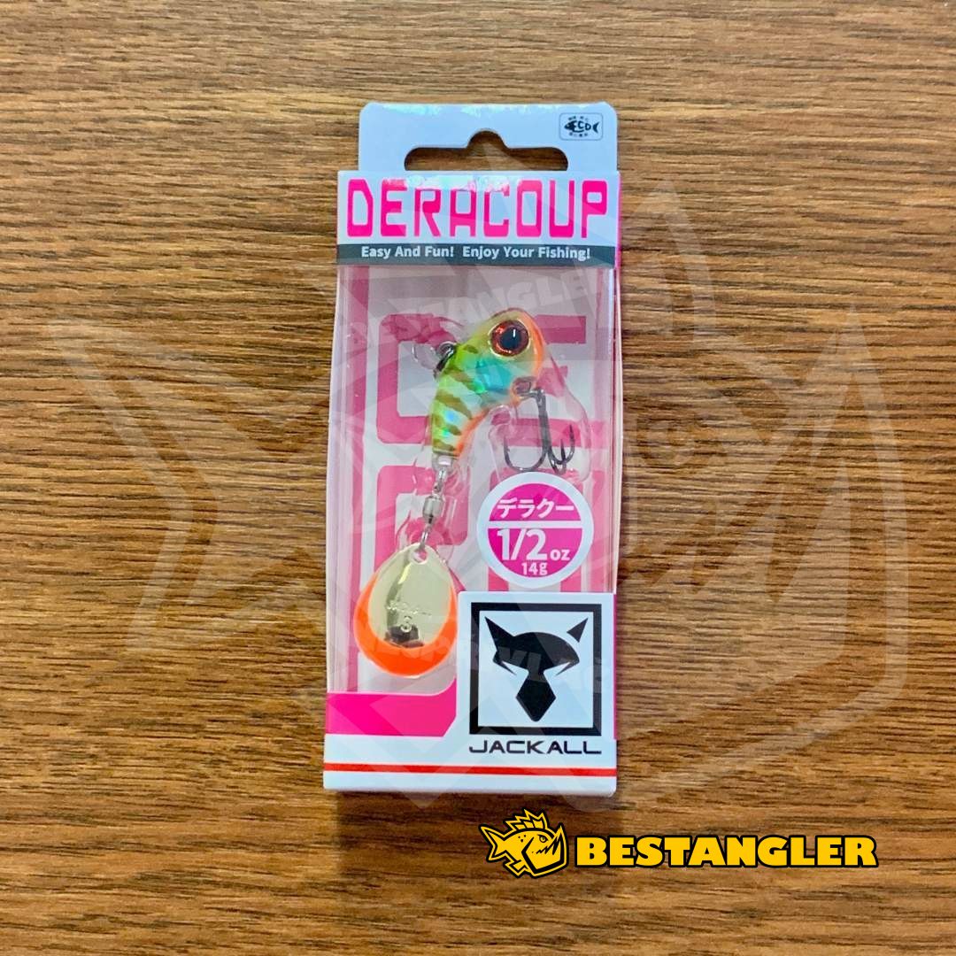 Jackall Deracoup patří mezi nejlepší tailspinnery na světě a dlouhodobě patří k nástrahám, na které se rybáři mohou spolehnout v jakýchkoliv podmínkách. Má kompaktní, těžké tělo s většinou hmotnosti soustředěnou v přední části, díky čemuž se s ním dá nahazovat opravdu daleko – a to i proti silnému větru. Malé tělo rybám usnadňuje nasátí nástrahy, takže většina záběrů končí úspěšným zásekem. Colorado rotační plíšek na kvalitním obratlíku se roztočí i při velmi pomalém vedení a vytváří silné vibrace, které ryby spolehlivě přitahují.
