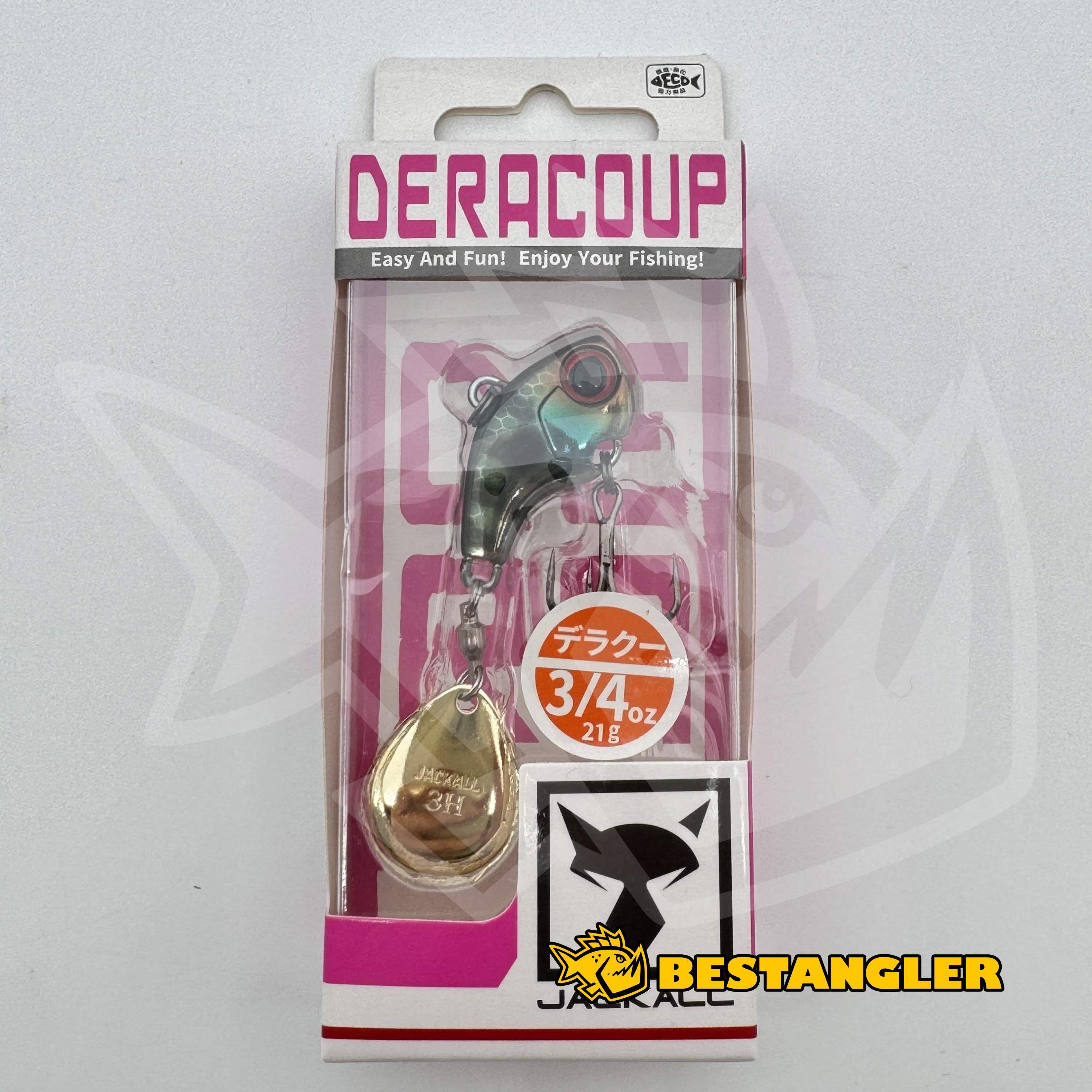 Jackall Deracoup patří mezi nejlepší tailspinnery na světě a dlouhodobě patří k nástrahám, na které se rybáři mohou spolehnout v jakýchkoliv podmínkách. Má kompaktní, těžké tělo s většinou hmotnosti soustředěnou v přední části, díky čemuž se s ním dá nahazovat opravdu daleko – a to i proti silnému větru. Malé tělo rybám usnadňuje nasátí nástrahy, takže většina záběrů končí úspěšným zásekem. Colorado rotační plíšek na kvalitním obratlíku se roztočí i při velmi pomalém vedení a vytváří silné vibrace, které ryby spolehlivě přitahují.