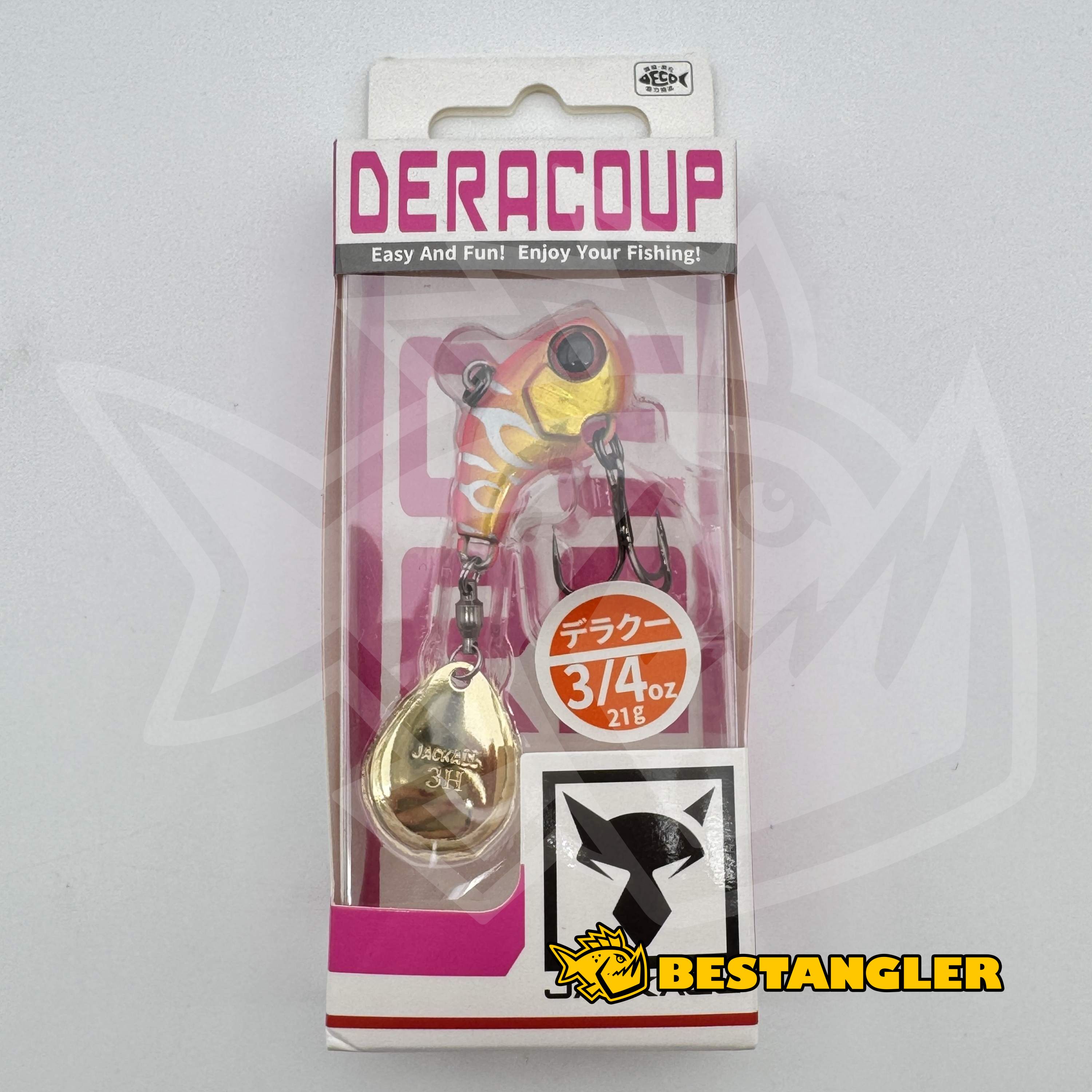 Jackall Deracoup patří mezi nejlepší tailspinnery na světě a dlouhodobě patří k nástrahám, na které se rybáři mohou spolehnout v jakýchkoliv podmínkách. Má kompaktní, těžké tělo s většinou hmotnosti soustředěnou v přední části, díky čemuž se s ním dá nahazovat opravdu daleko – a to i proti silnému větru. Malé tělo rybám usnadňuje nasátí nástrahy, takže většina záběrů končí úspěšným zásekem. Colorado rotační plíšek na kvalitním obratlíku se roztočí i při velmi pomalém vedení a vytváří silné vibrace, které ryby spolehlivě přitahují.