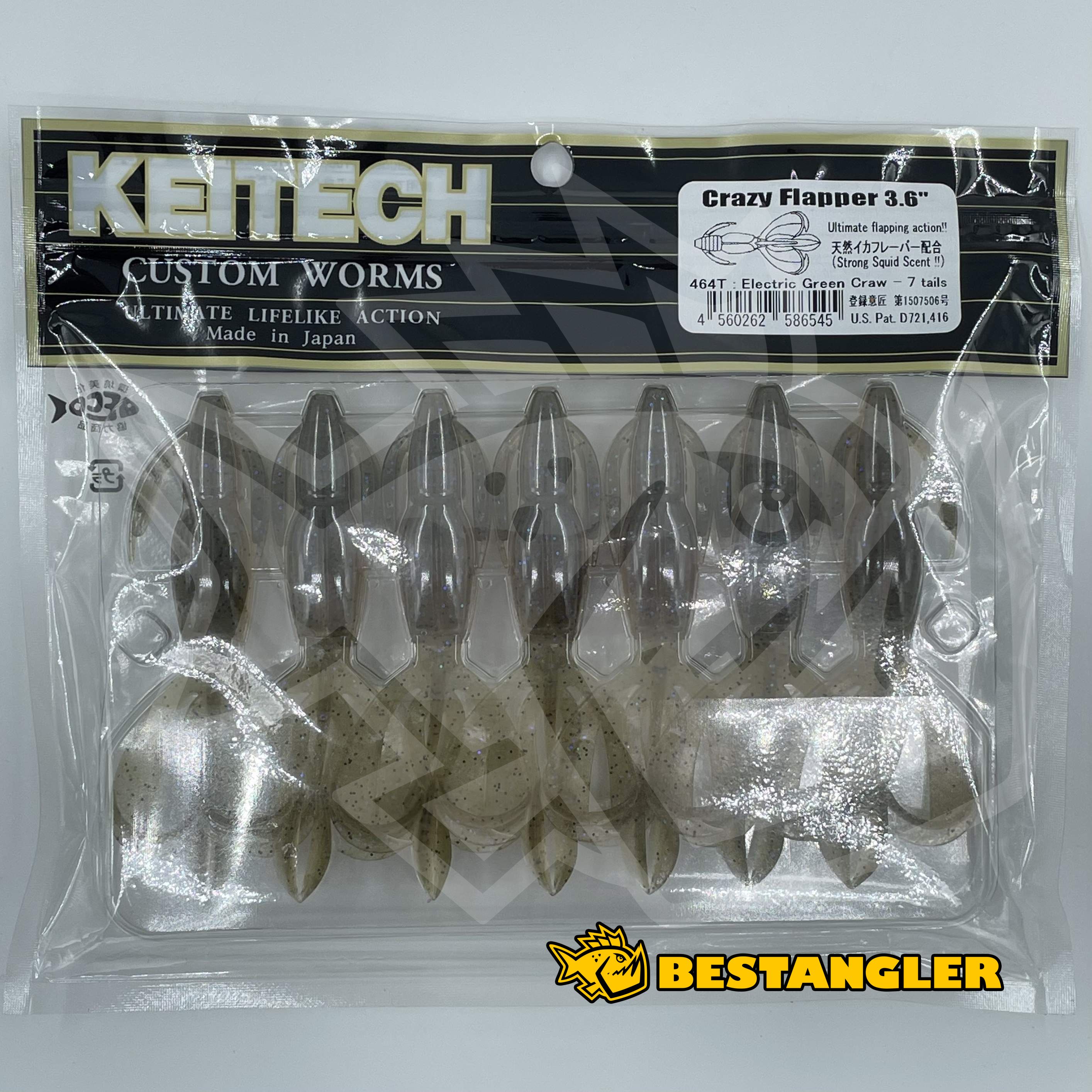 Keitech Crazy Flapper je vyroben kombinací dvou různých gumových materiálů, díky čemuž je měkký a zároveň velmi odolný. Nástraha je ochucena hrubými kousky soli a zvýrazněna silným, olihňovým aromatem, což ještě více podporuje její účinnost zejména při lovu velkých okounů. Skvěle funguje i pro lov štik a candátů. Základem úspěchu Crazy Flapperu je patentovaný tvar nástrahy. Tělo snadno propadá na dno i ve velmi silné vegetaci, klepeta a chapadla se neodolatelně vlní při sebemenším pohybu. Nástraha tak dokonale pracuje i při minimálním zatížení, při pomalém propadu často vyprovokuje k útoku i jinak neaktivní dravce. Crazy Flapper je možné nastražit na klasické jigové hlavičky, na Drop Shot, nebo Carolina / Texas Rig. Vyrobeno v Japonsku!