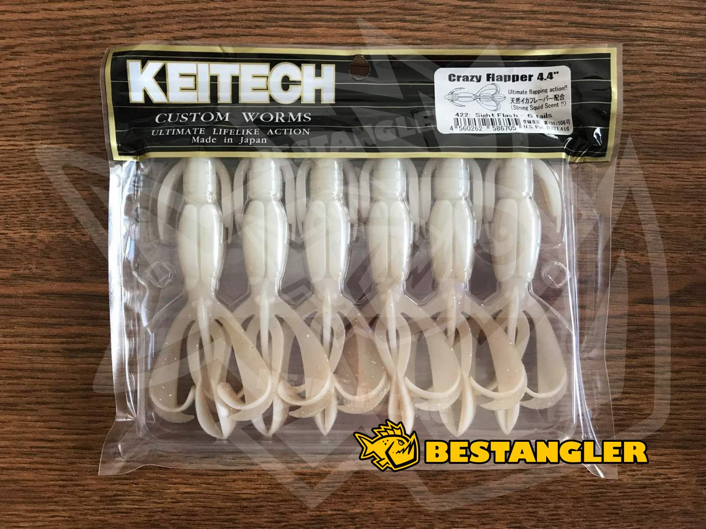 Keitech Crazy Flapper je vyroben kombinací dvou různých gumových materiálů, díky čemuž je měkký a zároveň velmi odolný. Nástraha je ochucena hrubými kousky soli a zvýrazněna silným, olihňovým aromatem, což ještě více podporuje její účinnost zejména při lovu velkých okounů. Skvěle funguje i pro lov štik a candátů. Základem úspěchu Crazy Flapperu je patentovaný tvar nástrahy. Tělo snadno propadá na dno i ve velmi silné vegetaci, klepeta a chapadla se neodolatelně vlní při sebemenším pohybu. Nástraha tak dokonale pracuje i při minimálním zatížení, při pomalém propadu často vyprovokuje k útoku i jinak neaktivní dravce. Crazy Flapper je možné nastražit na klasické jigové hlavičky, na Drop Shot, nebo Carolina / Texas Rig. Vyrobeno v Japonsku!