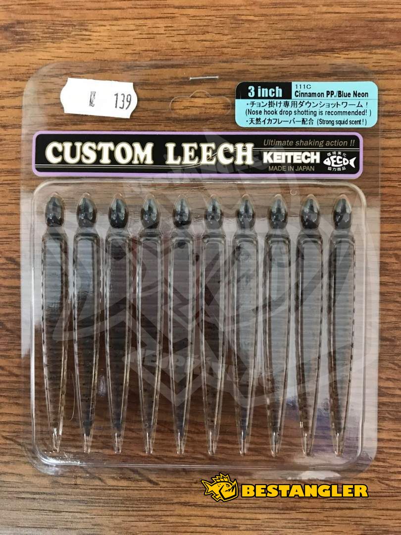 Gumová nástraha Keitech Custom Leech 3" (76 mm) je perfektní imitace velké pijavice. Segmentované tělo nástrahy zajišťuje reálný, velmi živý pohyb nástrahy. Nástraha je napuštěná silným olihňovým aroma. Nástraha je perfektní pro lov všech druhů pstruhů, okounů, štika a candátů. Často zláká také cejny, kapry a boleny. Gumová nástraha Keitech Custom Leech je perfektní na Drop Shot, lov s malou jigovou hlavičkou, nebo na lov s čeburaškou. Vyrobeno v Japonsku!