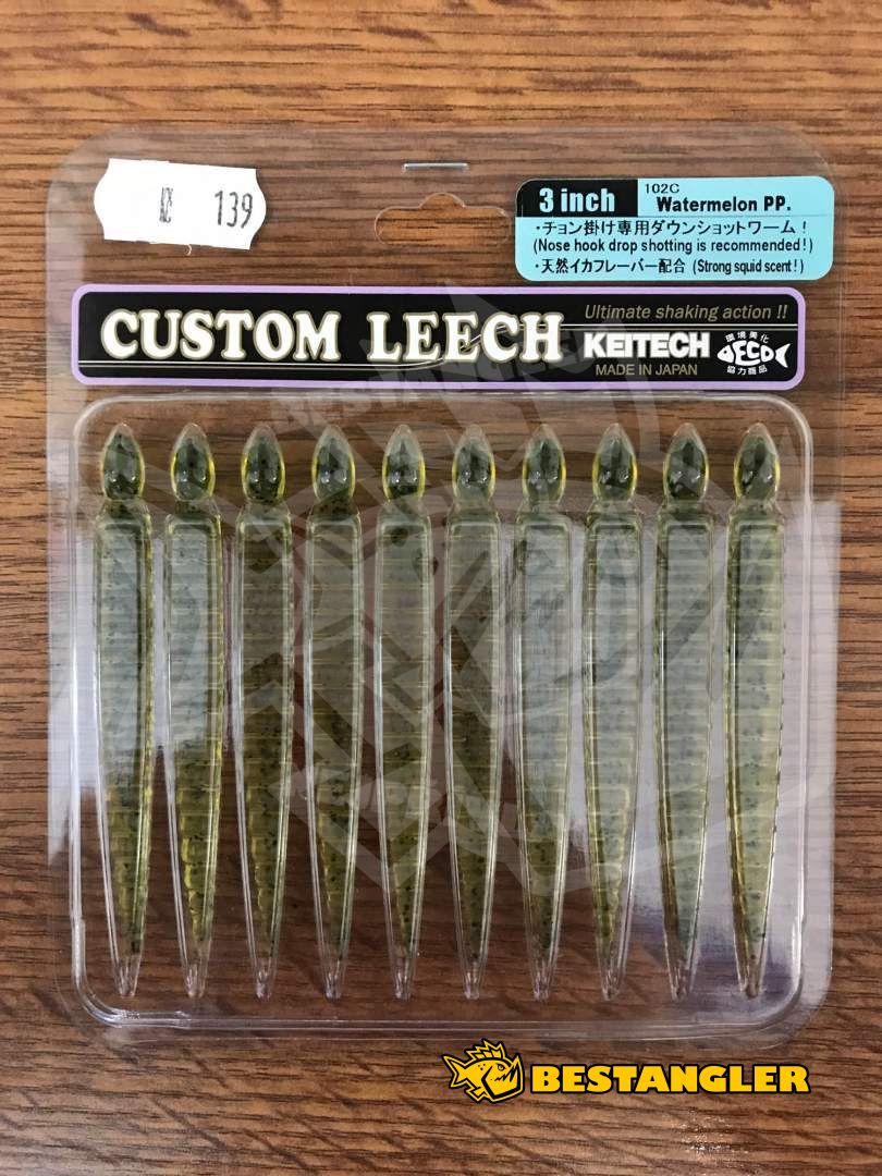 Gumová nástraha Keitech Custom Leech 3" (76 mm) je perfektní imitace velké pijavice. Segmentované tělo nástrahy zajišťuje reálný, velmi živý pohyb nástrahy. Nástraha je napuštěná silným olihňovým aroma. Nástraha je perfektní pro lov všech druhů pstruhů, okounů, štika a candátů. Často zláká také cejny, kapry a boleny. Gumová nástraha Keitech Custom Leech je perfektní na Drop Shot, lov s malou jigovou hlavičkou, nebo na lov s čeburaškou. Vyrobeno v Japonsku!