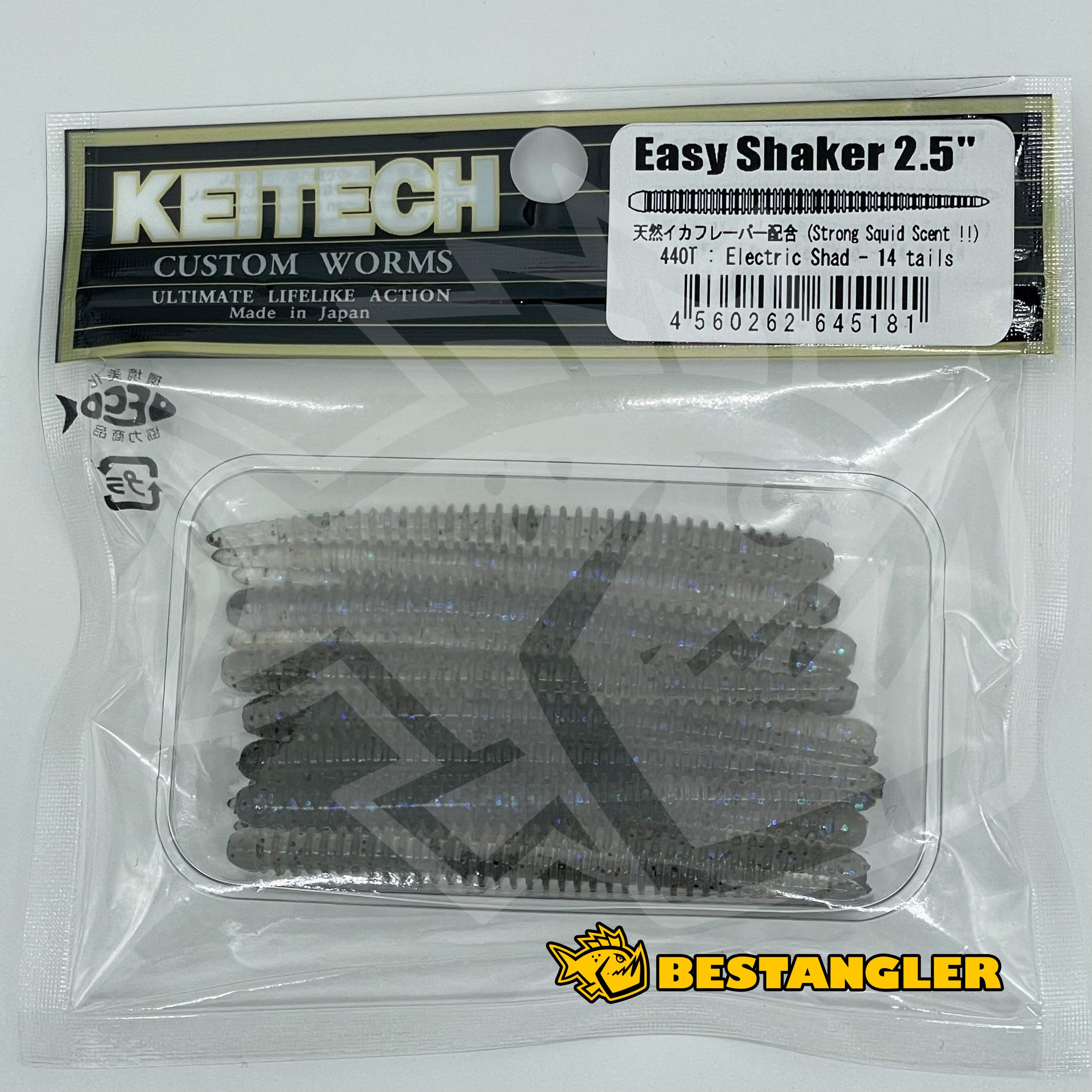 Keitech Easy Shaker je rovný gumový červ se silným olihňovým aroma, určený hlavně pro lov metodou Drop Shot. Kombinace prstencového těla a nesoleného materiálu umožňuje Easy Shakeru udržet vodorovnou polohu po dlouhou dobu. I ty nejmenší pohyby prutem, nebo proudění vody vytvářejí velmi realistický pohyb po celé délce těla červa. Prstencové žebrování pokrývající téměř celé tělo dává nástraze velkou siluetu, zatímco tenké jádro těla jí umožňuje pohybovat se velmi živě. Hlavová část červa Easy Shaker je trochu silnější, aby se dal lépe napíchnout na offsetový háček. Do zad a břicha nástrahy jsou umístěny drážky, díky kterým je špička offsetového háčku skrytá v žebrování a nástraha téměř nevázne. Nesolený materiál umožňuje červovi lákat ryby, aniž by ztratil vodorovnou polohu, ať už chytáte na Drop Shot s normálním, nebo offsetovým háčkem. Vyrobeno v Japonsku!