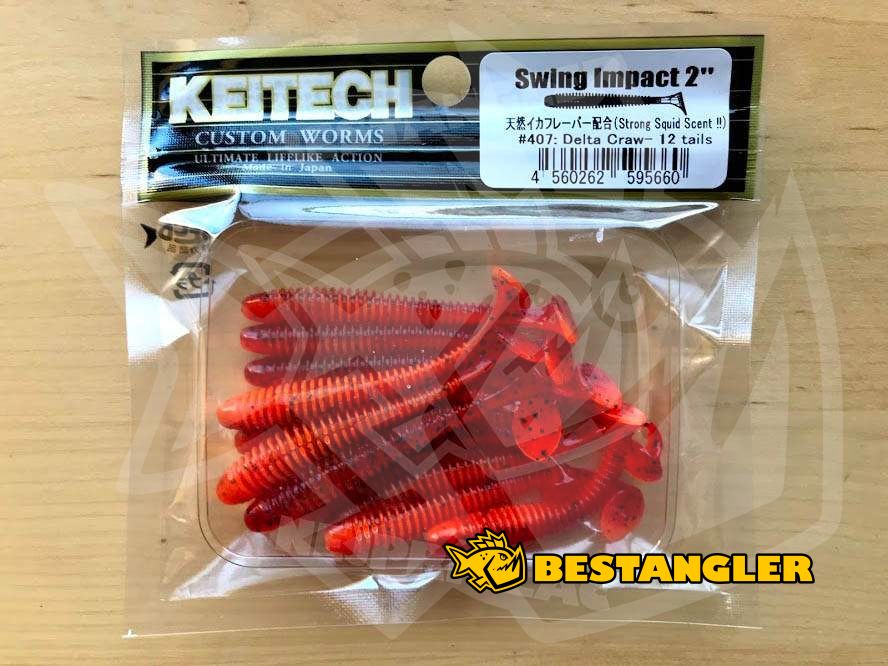 Keitech Swing Impact je osvědčená závodní nástraha. Má pravděpodobně nejlepší plovoucí akci ze všech srovnatelných swimbaitů. Vydaváné vibrace spolu s úzkým pohybem nástrahy přivádějí dravce k šílenství. Originální dvoutónový proces vstřikování barev používá různé druhy slaných plastů pro dosažení fantastického vyvážení a chodu nástrah Swing Impact. Nástrahy lze používat mnoha způsoby - na jigové hlavičce, na háčku bez zátěže, na Dropshot montáži, Texas Rig, Carolina Rig nebo Split Shot Rig. Nástraha má slanou příchuť a silné olihňové aroma. Vyrobeno v Japonsku!