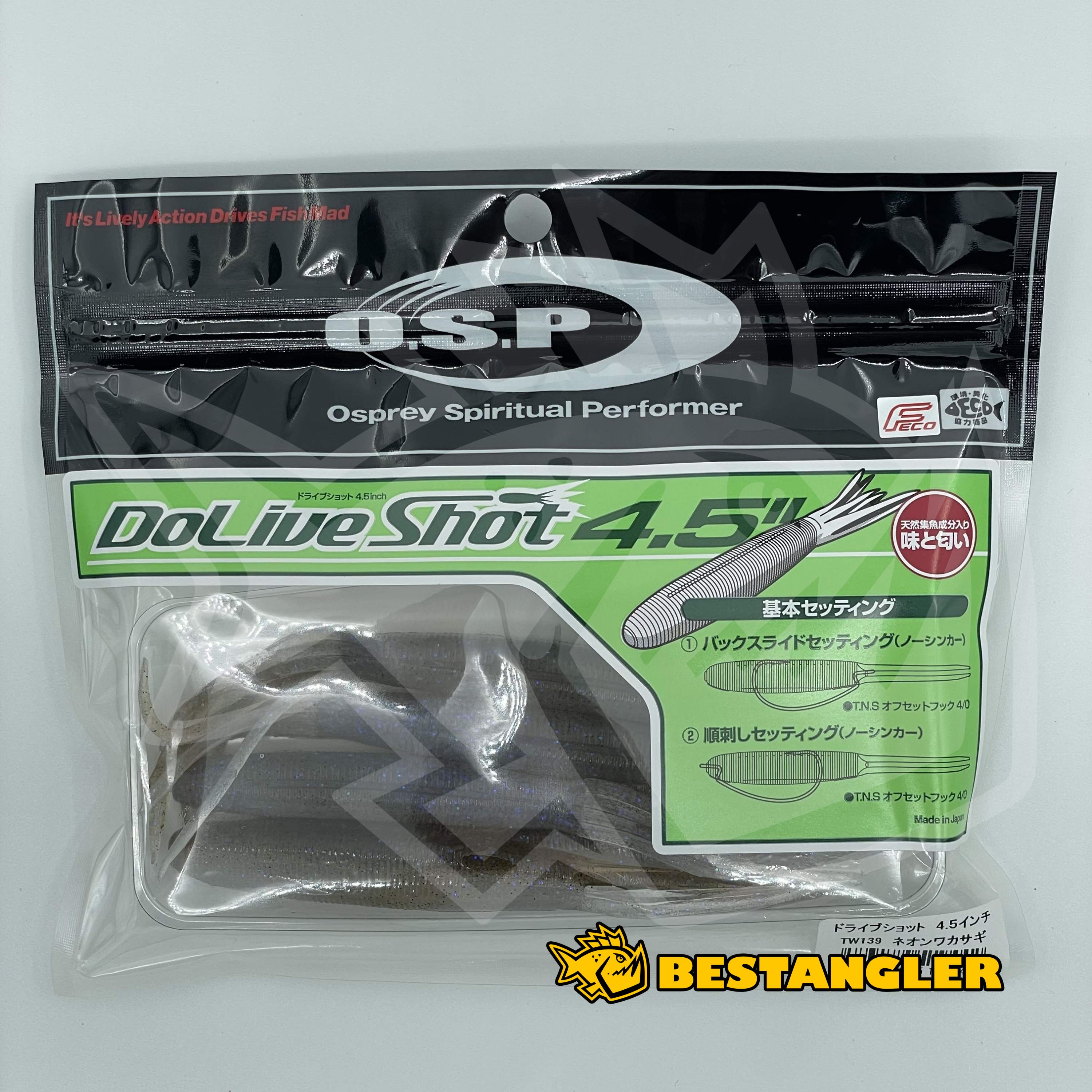 O.S.P DoLive Shot 4.5" je specializovaná gumová nástraha určená pro lov bassů. Nástraha se vyznačuje účinnou akcí při zpětném nastražení, které napodobuje nepravidelný pohyb prchajících krevet, čímž je pro basse atraktivní. O.S.P DoLive Shot je unikátně navržen tak, aby efektivně a bez stresu proplouval různými kryty a hustým porostem, a vyznačuje se výrazným designem, který zvyšuje jeho výkon při zpětném klouzání. Je vhodný pro celou řadu rybářských podmínek a je navržen tak, aby zvýšil šance na úlovek, zejména při závodním rybaření. Nástrahy mají silné olihňové aroma. Vyrobeno v Japonsku!