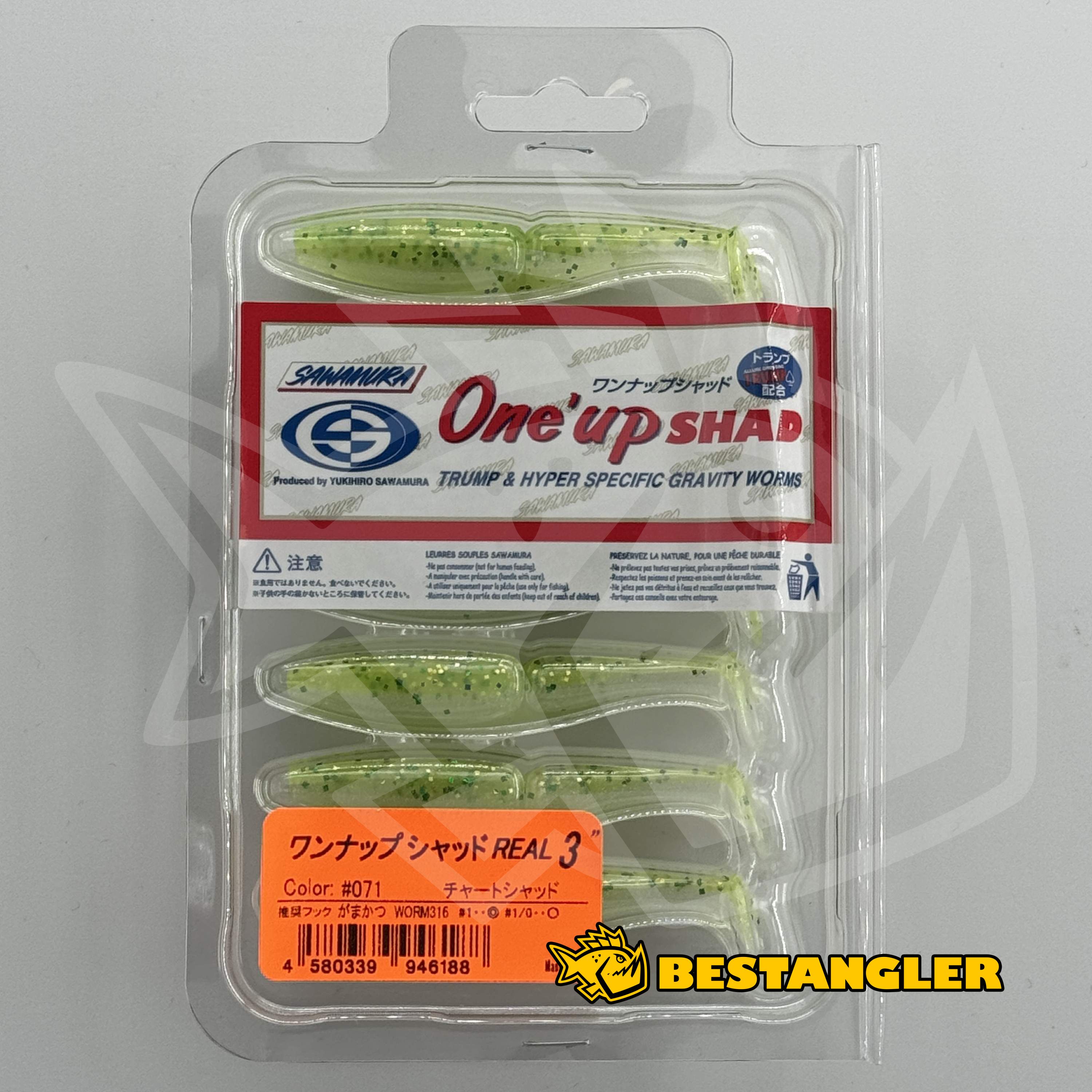 Nástraha je napuštěna nasládlým aromatem Sawamura TRUMP, které prodlužuje dobu držení v tlamce a zvyšuje úspěšnost záseku. Typickým znakem jsou také náhodně míchané barevné přechody – v jednom balení často nenajdete ani dvě naprosto stejné nástrahy, každý kus je originál. Díky plnějšímu, širšímu profilu vytváří One Up Shad výrazný tlak na vodu a je ideální pro lov na jigové hlavičce, offsetovém háčku, Texas a Carolina rig nebo i bez zátěže, kdy naplno vynikne jeho charakteristická akce.