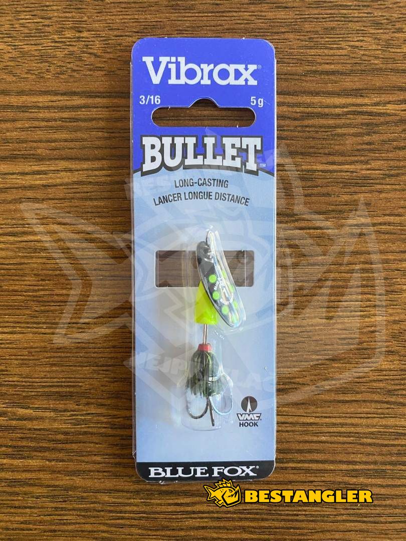 Blue Fox Vibrax Bullet Fly je zvuková rotační třpytka s listem ve tvaru oválu. Oproti klasickému Vibraxu mají třpytky Bullet Fly užší a delší list, který neklade vodě takový odpor a je umístěný přímo na ose třpytky, což způsobuje maximální vibrace. Třpytky Bullet Fly jsou také o 30% těžší, než standardní Vibrax ve stejné velikosti. Skvěle fungují v rychlejším proudu, nebo v hlubší vodě. Háček je opatřený sukýnkou z vláken, které zvyšují atraktivitu nástrahy. Třpytky Blue Fox Bullet Fly jsou extra účinné při lovu pstruhů.